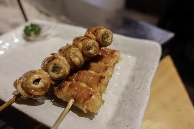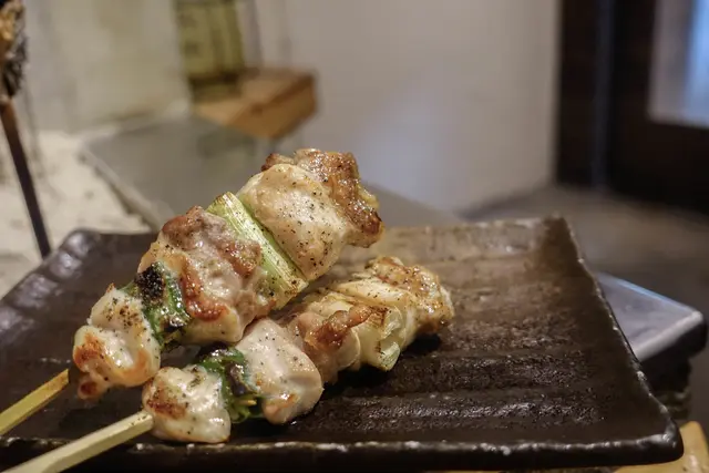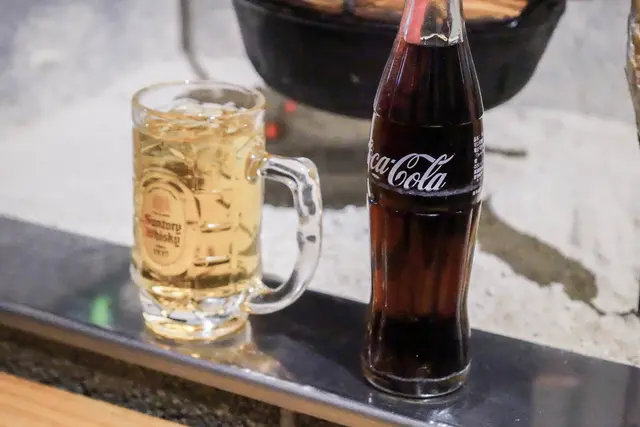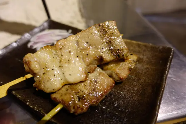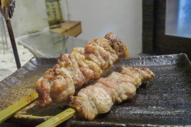 有別於一般烤至微焦的雞肉串,這可是店家的鎮店之寶,選用新鮮的且70天的桂丁雞,比市面上的雞肉還要來的高價,正因為夠新鮮,所以才敢以5-7分熟的口感來提供給消費者,完全沒有雞肉的肉味,裏頭的肉質略帶粉紅,吃起來一點也不恐怖,簡單的鹽烤方式與後勁十足的現磨山葵點綴,入口後的辛辣味從喉嚨緩緩冒出來,這時候再來杯酒,實在過癮。啊...我喝可樂!