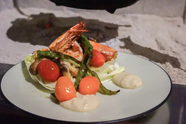 店家自製鯷魚醬,新鮮大蝦以拌炒方式處理,還有帶辣度的糯米椒,蝦肉以事先剝殻處理,十分細緻的一份餐點,蝦肉彈牙自然不在話下,鯷魚醬沒有腥味且配上糯米椒一起入肚,胃口大開啊!