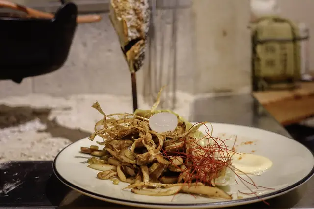裡頭有牛篣,白精靈菇,柳松菇,香菇,多種菇菇一起下鍋炒啊炒,牛篣絲脆口增添口感,我向來愛吃菇類,單吃就覺得好吃了,如果不夠味可以沾旁邊附的蒜味美乃滋,也是道下酒菜。