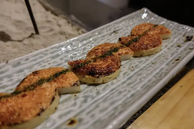 山藥磨成泥,我還真的不愛,但塊狀的話我倒可以吃,上面是明太子醬,一起與山藥進烤箱烤,帶點微焦但是咬下去的時候,會品嚐到明太子滑順濃郁與山藥脆口綿密的口感,明太子那特有的香氣與山藥的鮮甜,不錯。