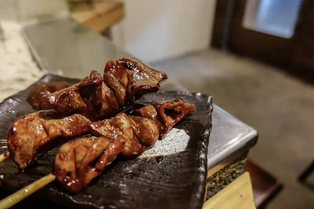這一道 我完全不敢吃,整盤給樂哥,我不敢吃內臟也不想說謊,所以讓樂哥來品嚐,雞心切開後在鹽烤,表面有塗了一些醬料,肉質厚實鮮嫩,樂哥說完全沒有腥味且有一股甜味,但我無法體會。