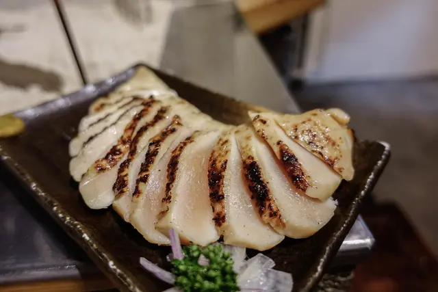我吃過很多一夜干,但我就是沒吃過雞胸肉做的一夜干,店家特製料理,新鮮雞胸肉風乾後在處理,口感完全已經跳脫雞胸肉口感了,像在吃火腿肉,又像在吃魚肉,很特別的一道菜,中間帶粉紅色澤但無腥味,沾上柚子醬吃,又是另一種味道了。