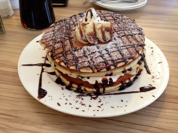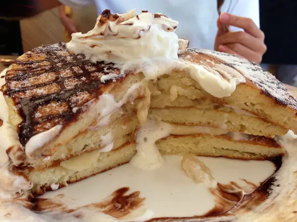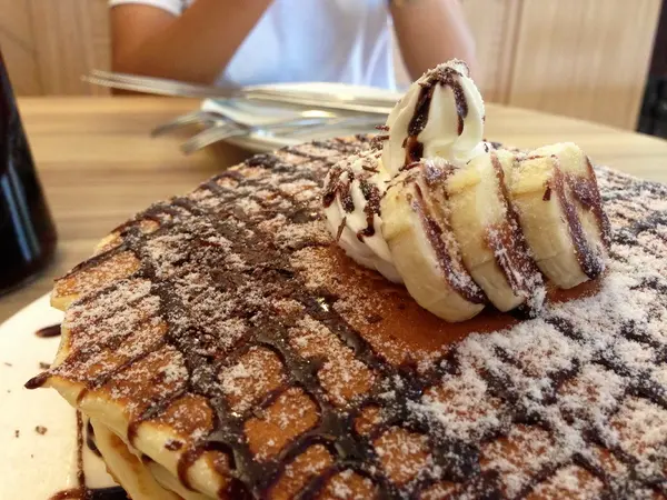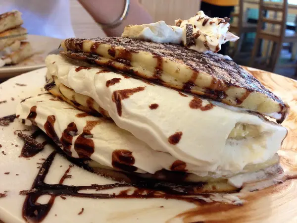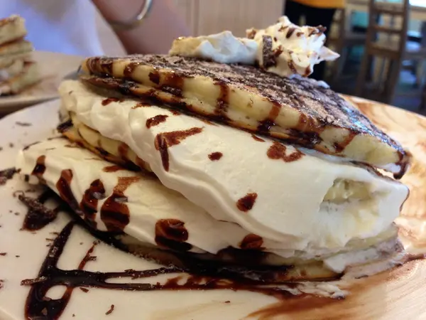 鮮奶油雖然多,可是輕盈不膩口,也不過甜,襯托香蕉的香氣,搭配蜂蜜和巧克力醬,
