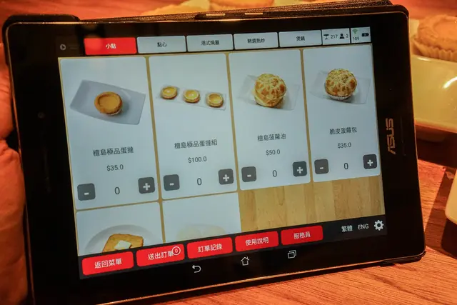 檀島茶餐廳是用平板點餐,只要選好餐點與份數再按底下紅色框框送出訂單就可以喔,完全不用跟服務人員對話或著等服務人員點餐,我覺得非常方便也很不錯,而且平板上的照片清楚易懂,不用擔心不會點餐,如果不懂可以詢問服務人員。