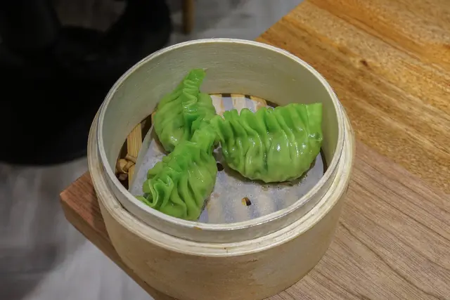 菠菜做成的綠色外皮,裡頭則有蝦仁,豬肉等等,即使不需要蘸醬也很夠味,三顆不夠我吃啦。