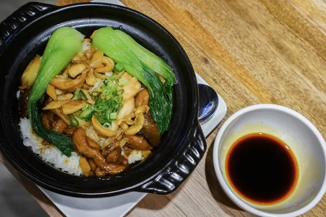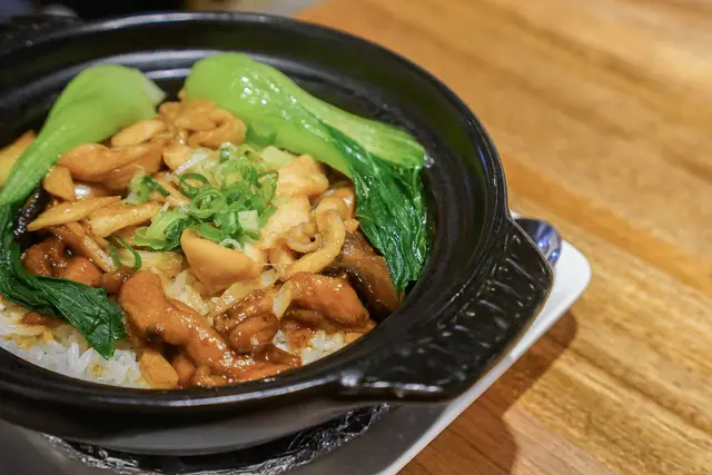 煲仔飯在港澳料理中應該是最多人最愛的,生米在陶鍋裡煮成熟飯,簡稱生米以煮成熟飯XD,其特別在於鍋巴,還有特製醬汁起鍋時沿著鍋邊淋上去,會發出吱吱作響的聲音,實在好聽,記得吃之前要仔細的拌一拌,米飯Q彈是我喜歡的口感,雞肉滑嫩自然不在話下,且分量算多,我跟樂哥吃都吃不完。
