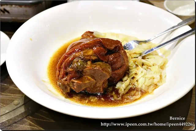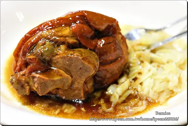 新鮮豬蹄,採先拋油後滷旁邊配著高麗菜乾