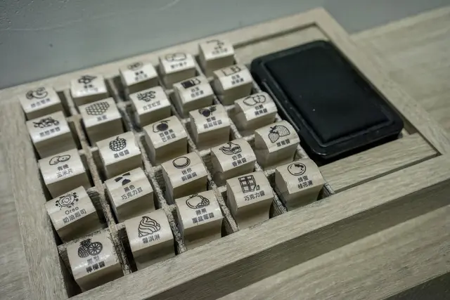 這是配料章,如果有嚴重選擇困難症的人,請直接讓店員推薦,選好自己喜歡的配料後,在蓋在冰品卡上即可,目前冰品有5種,其中宮古島雪鹽花生與有機玫瑰是台北店限定(有機玫瑰只供應到3/27)。