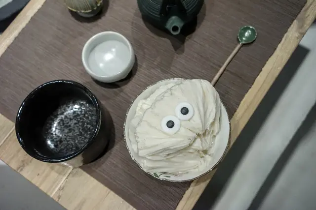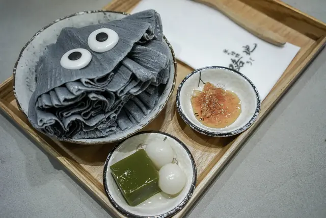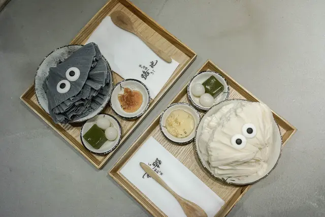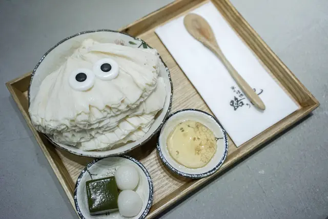 配料:白玉焙茶凍,蜂蜜桂花凍,白玉很Q有嚼勁,焙茶凍則是沒有甜味,但配著冰吃倒也不錯,蜂蜜桂花動我則是整顆直接吃掉,甜度稍高但算清爽,另外妖怪眼睛是糖霜做的喔。