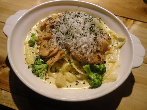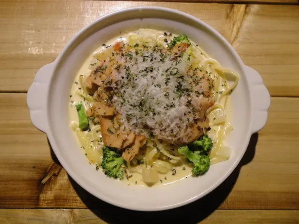 再從配料(培根、雞肉、燻鮭魚、時蔬)中選一,就組成你喜愛的義大利麵了。