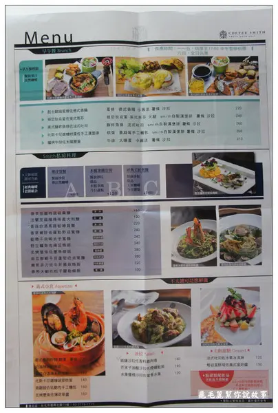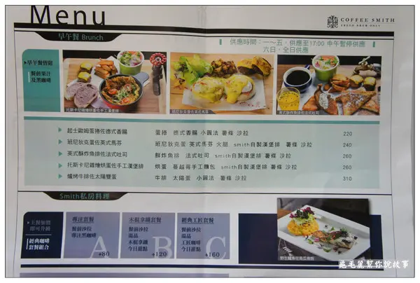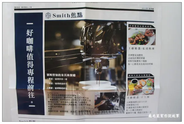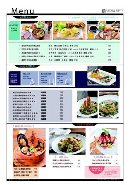 很好吃,為這一餐做了最最完美的結尾! 『Smith』原有鐵匠、工匠之意,是指以專注的神情,鍛造出細緻精密的鐵工具。這樣的職人精神,也可以延伸在咖啡師身上。專精於咖啡豆、咖啡機、製作 技巧,與豐厚的咖啡文化,以認真的態度為顧客沖泡出每一杯咖啡,仔細勾勒出優雅的拉花,完整呈現出每一杯咖啡的精華。『coffee smith』提供優質精品咖啡,秉持著對咖啡的狂熱與執著態度,造就了專業咖啡的新標竿。並將這樣的職人精神,一併在料理上展現,主廚嚴謹食材,用慢火熬煮的醬汁,講求每一道工序與細節,只為呈現完美的料理給消費者。 最後,要分享一個才剛出爐的超值好消息:春季限定的晚間分享餐:兩人份的餐點,包含每日湯品、沙拉、前菜、主餐四選二,雙人分享餐居然只要588元?!即日起就上菜囉!想要嘗鮮的人動作快!!!午餐時間聽說天天客滿,若能下班之後前往,可以更悠哉地用餐,這樣的價格,真的太划算啦!(以下圖片片摘自粉絲頁)
