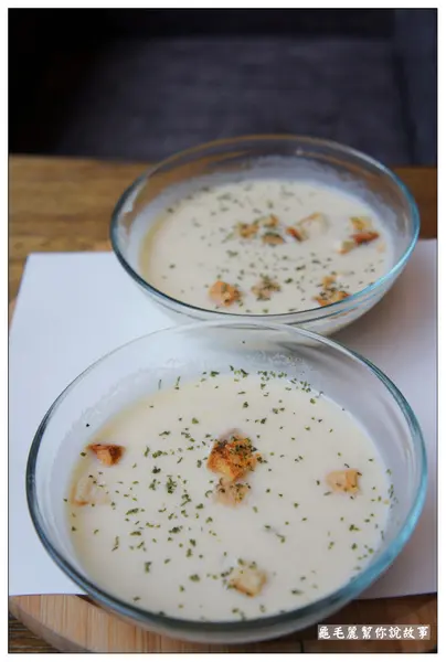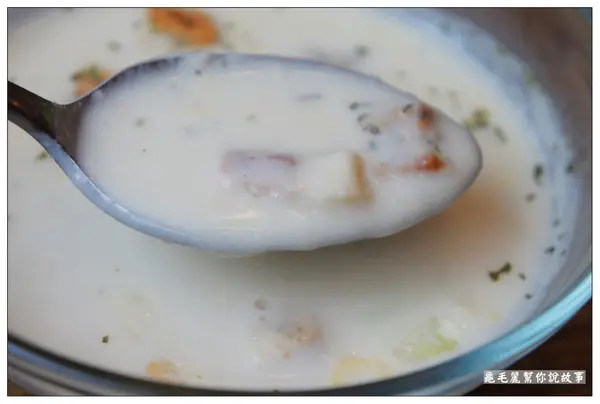 裡面有麵包丁、馬鈴薯、洋蔥等…濃稠度和調味恰到好處,是好喝的湯。