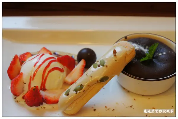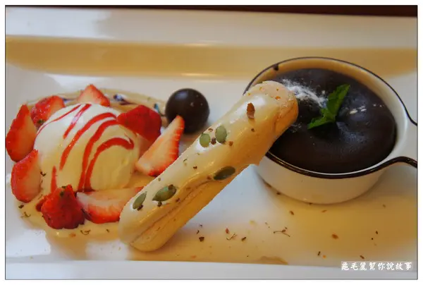 冰淇淋的甜度適中,搭配草莓,微酸微甜,加上冰涼的口感,若是和熔岩蛋糕交錯吃,會有一種冰火五重天的效果。