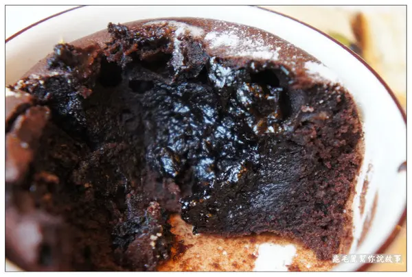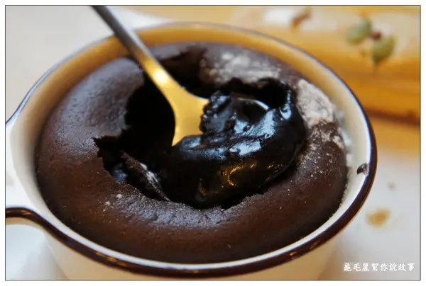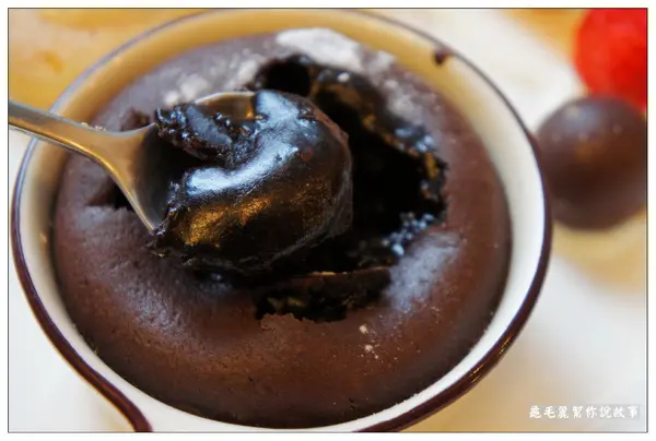 熔岩蛋糕的表層,有點酥脆的感覺,用湯匙向下挖,看到裡面濕潤滑順,感覺好好吃喔。