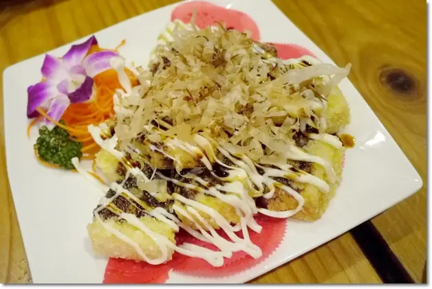 炸的香酥的雞蛋豆腐淋上醬料及美乃滋後,再撒上會跳舞的柴魚片,豆腐軟嫩不油膩,還不錯