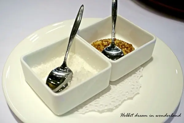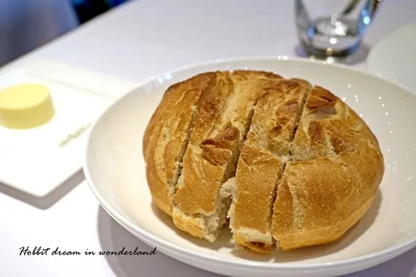 餐前麵包佐奶油沾醬,奶油的另一旁還有海鹽可以添加變換風味