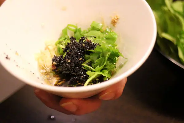 服務人員特調的魚麵專用醬汁,有花生粉、香菜、黑豆豉醬、蒜頭及砂糖。