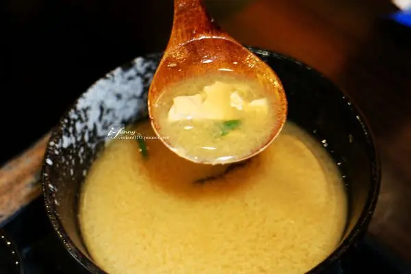味噌湯是採非基改的黃豆製成的味噌,喝來味道頗足,還有豆腐及海帶芽。