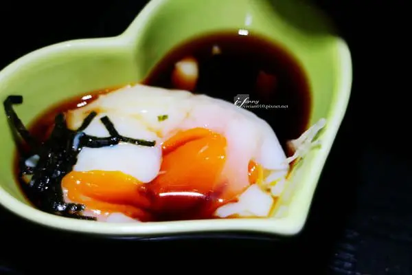 這個月見溫泉蛋上桌是微熱的,和著海苔絲及特調醬汁,沽溜溜地就滑進口中。
