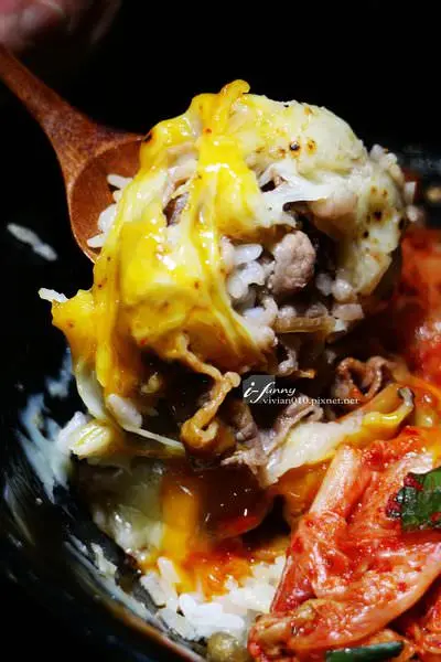 最過癮的吃法就是白飯與牛肉,和上蛋液及起司一起入口,