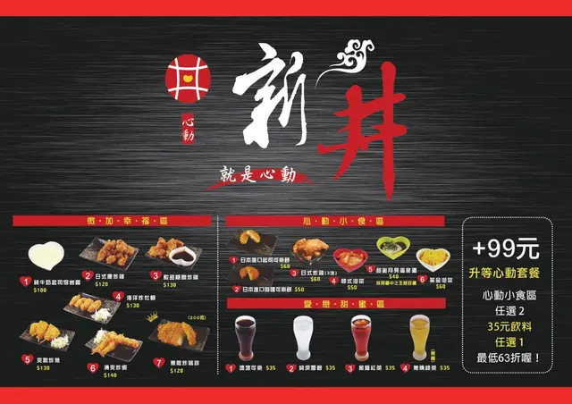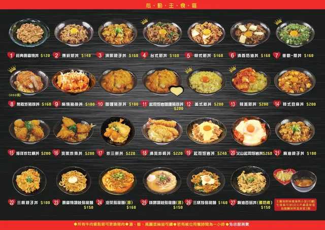 新的MENU有27款丼飯(包含四款麵類),其有四道的餐上面畫了皇冠,代表是店裡招牌。每道餐名前面有紅色愛心及數字,點餐的時候直接講號碼讓店員很快明瞭,加快點餐速度。