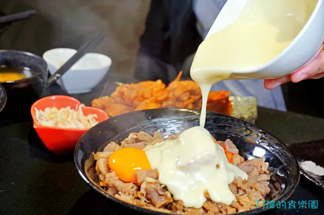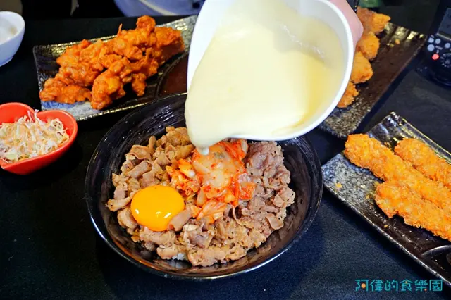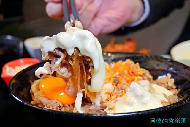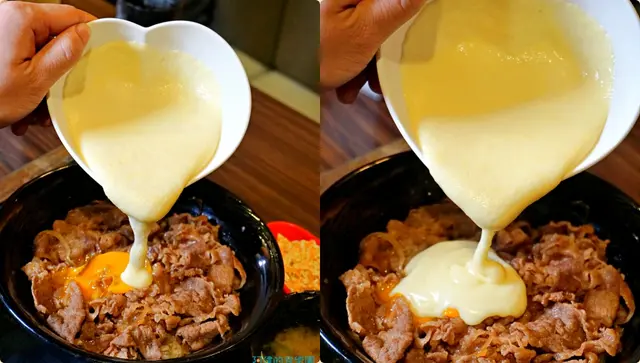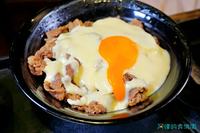 新丼的招牌特色就是有許多的起司丼飯,阿偉三年前吃的是”美式新丼”,這次要試的新產品-起司熔岩丼。兩者的差別是”美式新丼”將起司鋪在白飯上加以烤過,而”起司熔岩丼”則是將熱起司另外放在一個碗裡,由客人自行淋在丼飯上,這過程超香而且超療癒。