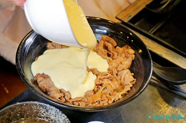 先將生蛋黃放在牛肉片中央,然後將碗裡的熱起司倒下,由於流速緩慢,看著它的狀態非常療癒。