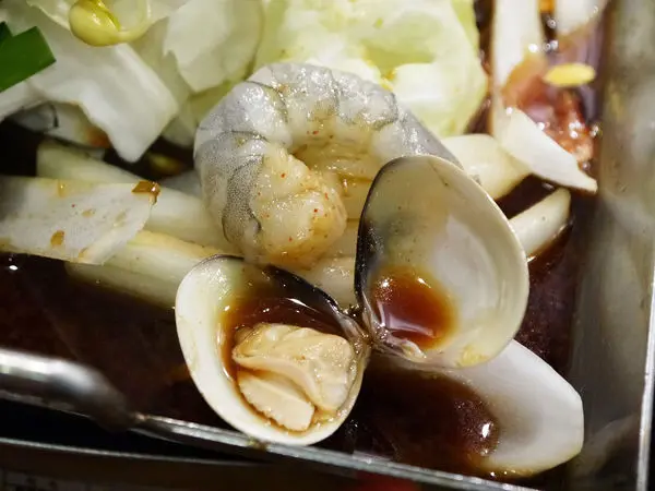 這「海鮮平盆鍋」的海鮮料有蛤蠣、花枝、蝦仁跟牡蠣