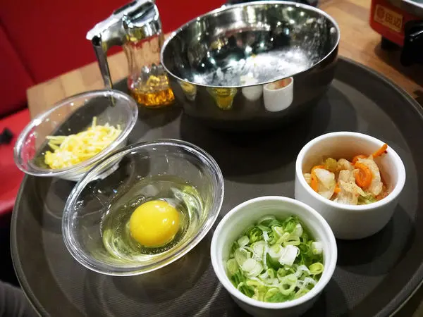 然後這鍋巴飯還有五大配料 - 泡菜、蔥花、蛋、起司與麻油