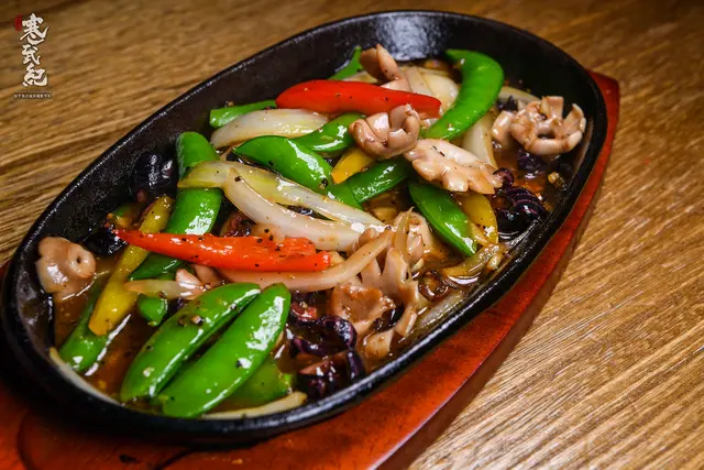 珍貴的烏魚胗口感極脆,搭配有點類似黑胡椒牛排的鐵板料理方式,拌炒野菜,台味十足!