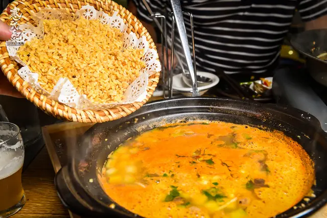 炸過得米飯,感覺有點像「炸米香」的口感,放入海鮮濃郁的湯頭中,光看就知道這道菜一定超好吃!中了啦!