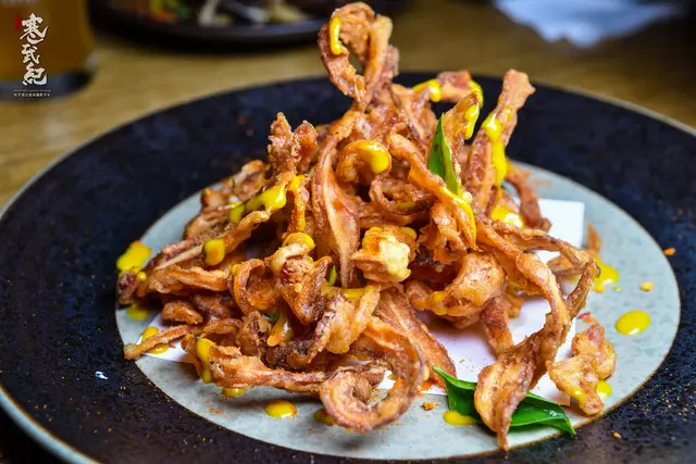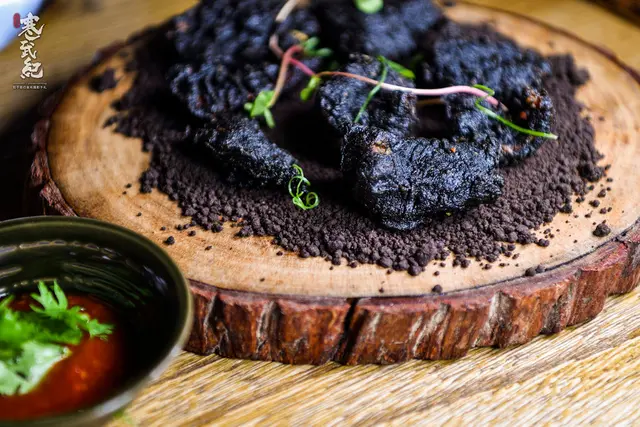 鮮魚、魷魚包裹著墨魚汁製成的炸粉,炸出來的炸品看起來黑黑圓圓,就像石頭一般!視覺效果完全讓人摸不著頭緒吃起來是什麼口感,事實上就是炸海鮮,搭配五味醬頗為對味!