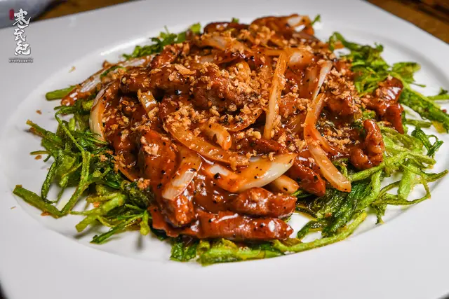 有點微妙的創意菜色,包子爸也很難形容好不好吃,第一次吃到炸空心菜,老實講,好像有點偏油,搭配黑胡椒醬牛肉絲鹹中帶些甜味,有點像夜市牛排的風味,不過炸空心菜真的太微妙了~~哈哈!