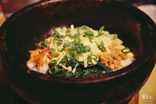 石鍋泡菜起司拌飯:泡菜、豆芽菜、蔬菜、味增、蔥、白飯、起司當所有平凡的配料攪拌再經過石鍋的熱氣環繞後,脆硬的鍋巴卻變得好經典,記得趁熱吃最好吃唷!