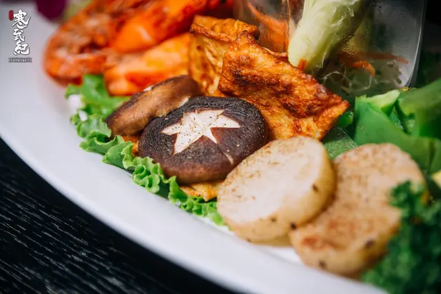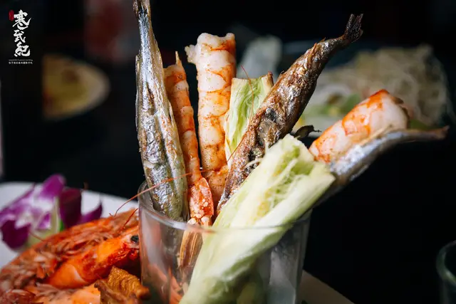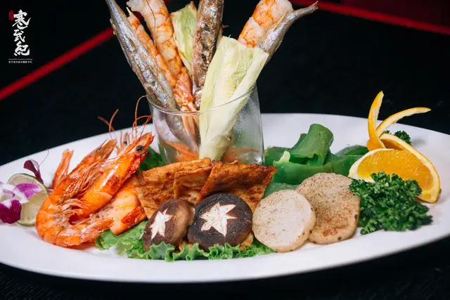 烤蝦史紅蝦、烤草蝦、山藥、玉米筍、香菇、韓國甜不辣、柳葉魚