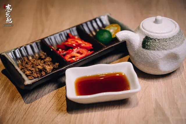 拿起桌上的白色醬瓶裡面附上的淡醬油(特製醬汁)可以適量倒一些沾雞肉吃。