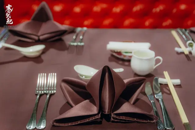 桌面陳設就像五星級飯店一樣講究,刀叉碗筷一應俱全,桌巾還折的如一朵花~