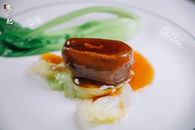 一整顆紮實嚼起來夠勁的智利小鮑魚,醬汁煨的極為入味,搭配稍微川燙過得美生菜一起入口更顯甘美多汁!