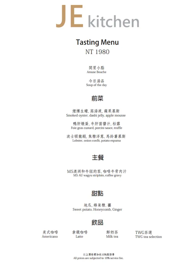 為什麼要從「A COMMUNITY」改為「JE」呢?原來是因為機緣巧合,創辦人Jimmy 找了在法餐界頗有名聲的陳鏡謙主廚 (Elvis Chen) 合作,然後各自取英文名字的第一個字母為名,改為「JE kitchen」。九月份開始推出新的套餐,也希望透過改名,增添更多主廚的元素和創意菜色。
