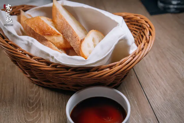 用葡萄酒醋和橄欖油調和而成的油醋,帶些濃稠,沾麵包吃更合適,油醋醬帶些甜,還不錯吃。
