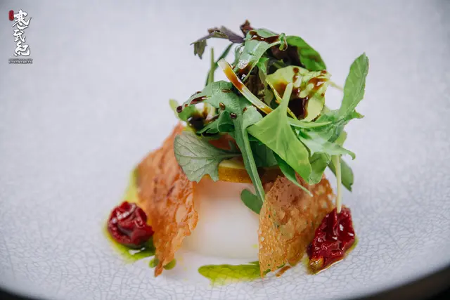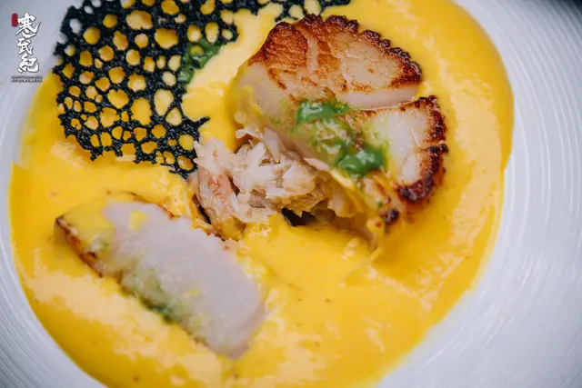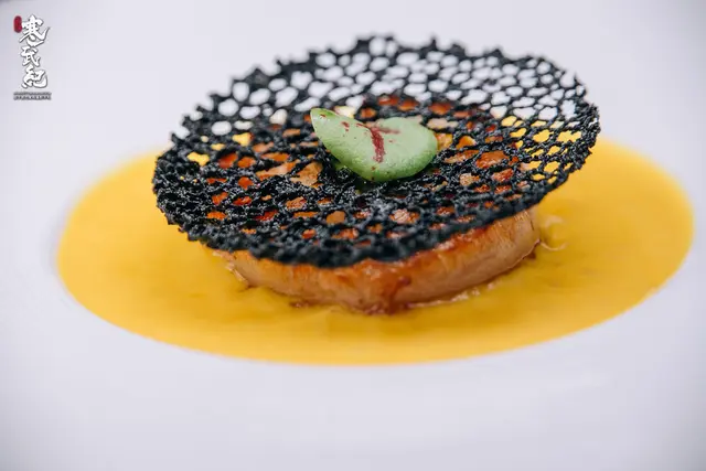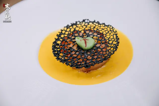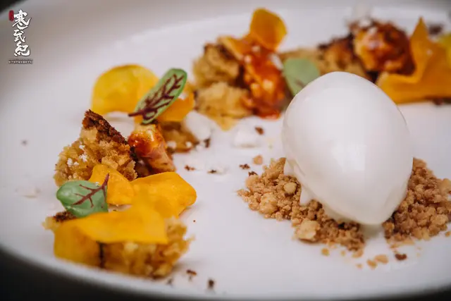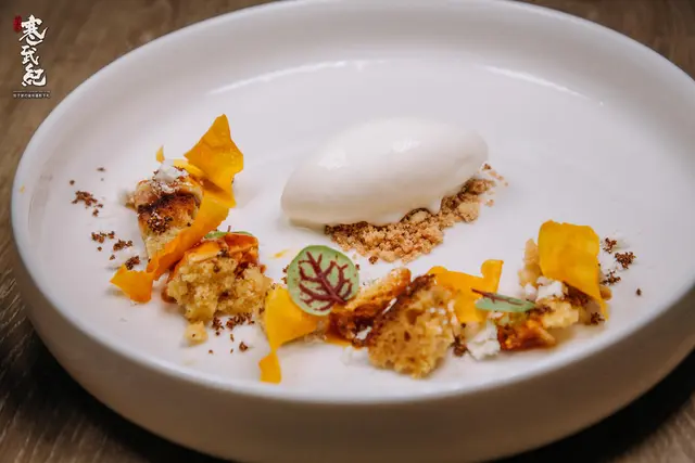 妝點的美侖美奐,讓人不忍破壞的一品招牌甜點,運用了台灣當地的特產地瓜,製成了地瓜脆片、地瓜海綿蛋糕還有奶霜,搭配上煙燻牛奶口味的冰淇淋、蜂巢糖和薑脆片,吃起來層次感非常豐富!