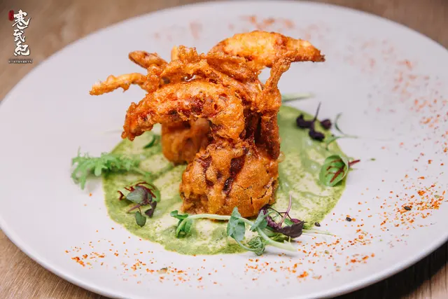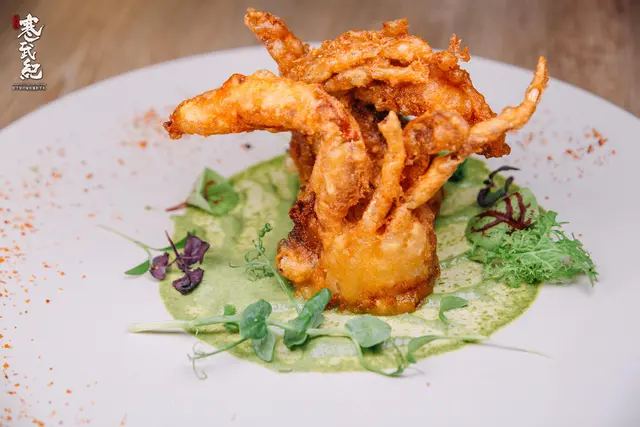 炸到脆口入口卻綿密滿滿蟹肉香的軟殼蟹,搭配自製青醬,真是美味!