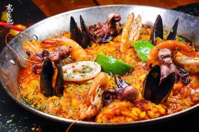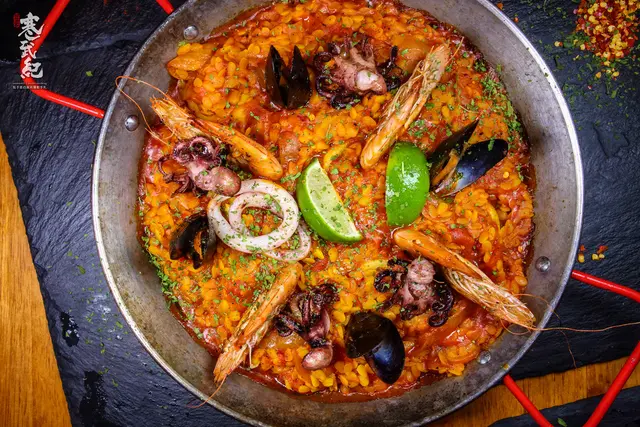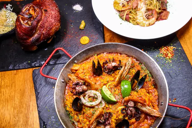 這道跟包子爸想像中的西班牙海鮮燉飯不太一樣,米不是燉飯米,而是選用米型義大利麵,燉煮得很軟,茄汁味道非常重,不辣,帶些濃重的甘甜味,海鮮用料頗為實在。