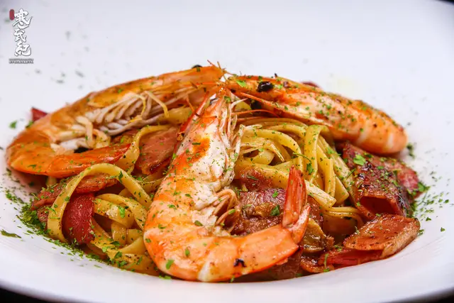 寬麵搭配大蝦培根,帶些微辣,經典的蕃茄香蒜風味,價格也不貴,晚餐好選擇!
