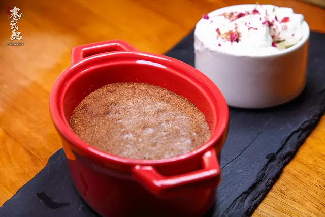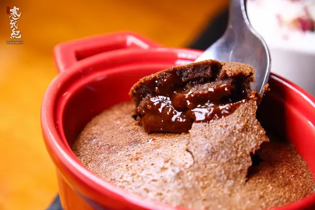 表皮烤的炙脆,舀下一口會看見滿滿濃郁榛果巧克力的吸睛岩漿蛋糕。