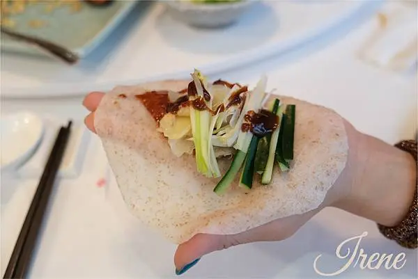 除了搭配了蔥絲、小黃瓜、甜麵醬外
