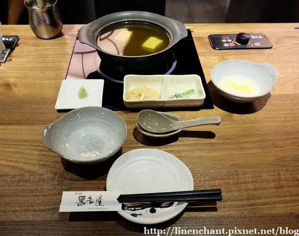 這就是南蠻蔥鴨鍋的厚柴魚湯底,然後這裡一開始吃飯時花招很多...