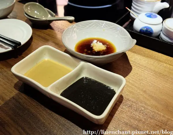 然後醬汁的搭配也不馬虎,就是湯鍋前那四盤有柚子醋、蔥油、腰果醬、芥末(右至左)葉子點了是宜蘭產六白黑毛豚涮涮鍋,搭配的醬汁是有橙醋、黑、白芝麻醬~