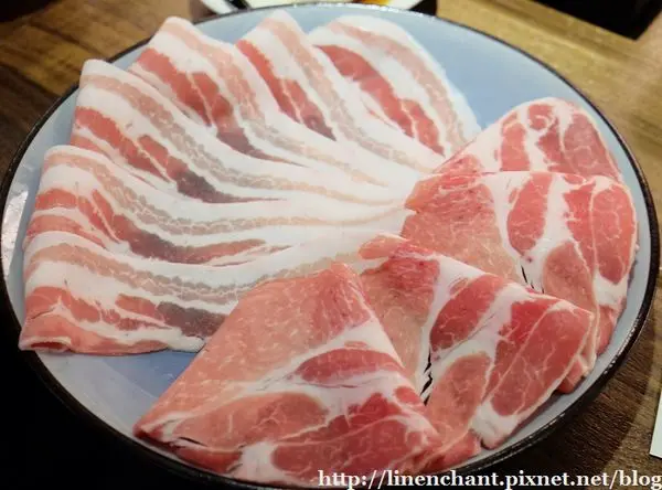 然後搭配了多款醬汁裡面,我最喜歡的則是蔥油醬汁....吃起來最合我胃口啊!!!!葉子點的宜蘭產六白黑毛豚涮涮鍋(680元+10%)有梅花跟培根兩種肉類搭配喔...葉子都有涮兩種肉給我吃,肉質都很好~~切的厚度很剛好,吃起來很飽嘴....