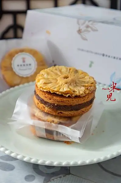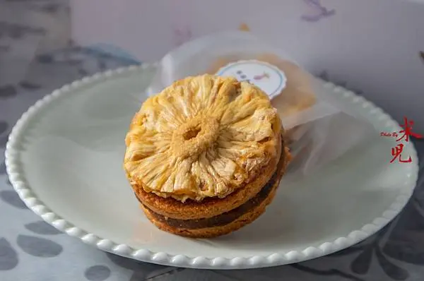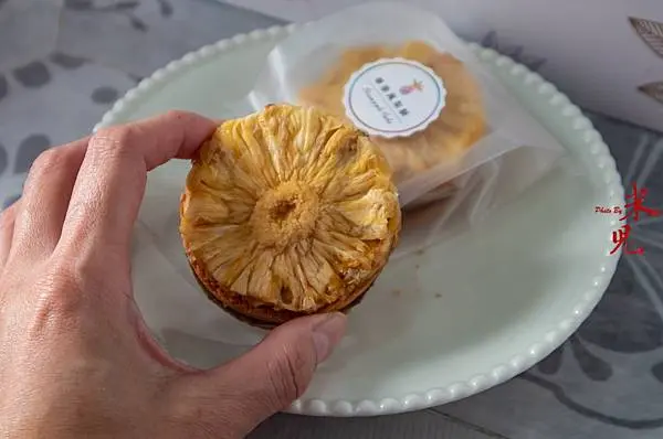 鳯梨果乾是特別做的厚一點的金鑽鳯梨乾,清甜不膩就連芯都柔軟無渣好入口,而鳯梨酥本身也跳脫傳統包餡模式,以夾心酥的方式呈現,酥香的餅皮裡夾著用土鳯梨和冬瓜醬做的餡,不會像土鳯梨餡那麼酸,卻又不像傳統冬瓜餡那麼甜,恰到好處的酸甜,和帶著焦糖香氣的酥餅一起咬下去,口感真是絕了,大推大推!!!